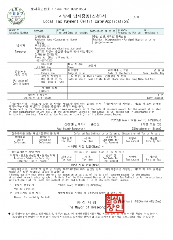 지방세납세 갱신 (유효기간 : 2026/01/02) 페이지 정보 작성자: 최고관리자   댓글: 0   조회수: 697 날짜: 2022-10-24 본문 지방세납세증명서 갱신* 업로드일 : * 유효기간 : 2026/01/02 목록 이전글공급원승인서류 2024.01.17 다음글납세증명서 갱신 (유효기간 : 2026/01/02) 2022.10.24