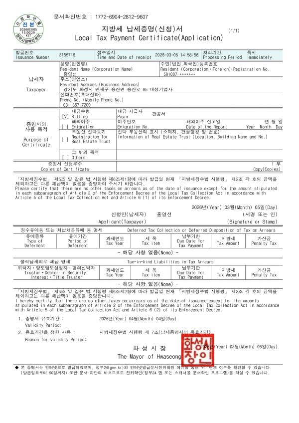 지방세납세 갱신 (유효기간 : 2026/04/04) 페이지 정보 작성자: 최고관리자   댓글: 0   조회수: 785 날짜: 2022-10-24 본문 지방세납세증명서 갱신* 업로드일 : * 유효기간 : 목록 이전글공급원승인서류 - 갱신일 26.03.20 2024.01.17 다음글납세증명서 갱신 (유효기간 : 2026/04/04) 2022.10.24