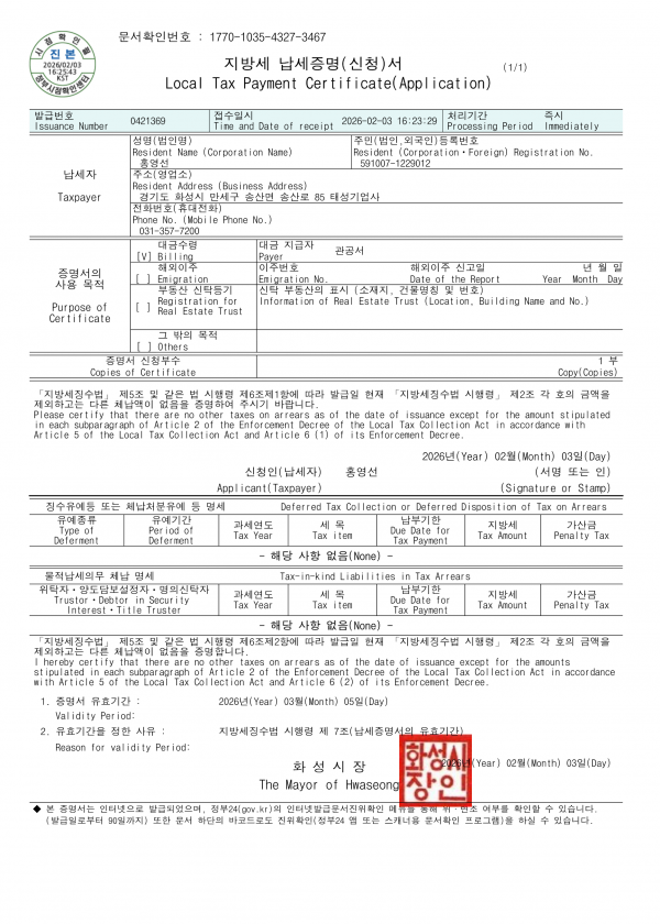 지방세납세 갱신 (유효기간 : 2026/03/05) 페이지 정보 작성자: 최고관리자   댓글: 0   조회수: 740 날짜: 2022-10-24 본문 지방세납세증명서 갱신* 업로드일 : * 유효기간 : 목록 이전글공급원승인서류 2024.01.17 다음글납세증명서 갱신 (유효기간 : 2026/03/05) 2022.10.24
